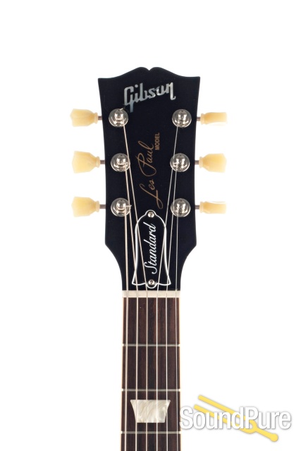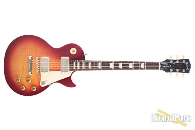 The new Les Paul Standard returns to the classic design that made it relevant, played and loved -- shaping sound across generations and genres of music. It pays tribute to Gibson's Golden Era of innovation and brings authenticity back to life. The Les Paul Standard 50's has a solid mahogany body with a maple top, a rounded 50's-style mahogany neck with a rosewood fingerboard and trapezoid inlays. It's equipped with an ABR-1, the classic-style Tune-O-Matic bridge, aluminum stop bar tailpiece, vintage deluxe tuners with keystone buttons, and aged gold tophat knobs. The calibrated Burstbucker 1 (neck) and Burstbucker 2 (bridge) pickups are loaded with AlNiCo II magnets, audio taper potentiometers and orange drop capacitors.