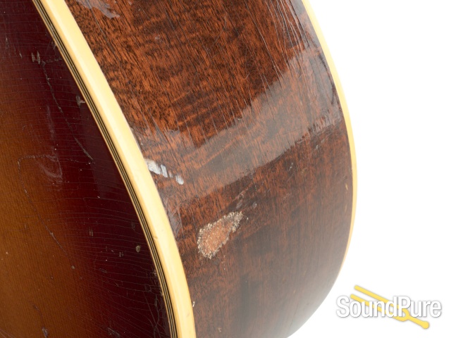 This is what acoustic guitar is all about. A guitar that was owned by a couple different generations of a family, played and cared for all along the way. It's got the history and it's got the sound--warm, sweet, and woody with a soft hand; punchy and honky when you lean in. Truly the "Gibson sound" players revere the world over. And a great look, too! Unusually high figuring in the Mahogany on that back set. It's no surprise that this guitar needed some routine maintenance with all the mileage on it--our luthier performed a neck reset and bridge reglue (a particularly nice piece of craftsmanship on that bridge courtesy of the highly talented Jim Merrill of Merrill guitars), both jobs going wonderfully. Now she's ready for playing--get to it!