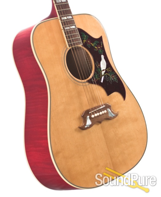 This famous flame maple-backed dreadnought introduced in the early ‘60s is intertwined with one of the most revolutionary decades in popular music history. Its maple back & sides and long scale produce the crisp, clear tone and projection associated with the SJ-200 while the square-shoulder body brings a balance and warmth usually associated with the Hummingbird. The handcrafted pickguard, with a single mother-of-pearl dove inlaid among hand-painted wild roses, make this guitar instantly recognizable as a true child of the ’60s. Ships with a certificate of authenticity.