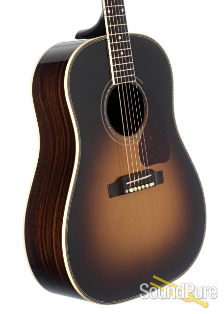 For a player who's always loved the shape, scale, and look of a J-45 looking for something with an increased sonic range, enter the J-45 Custom! At once familiar and altogether different the addition of Rosewood to the sonic equation imbues this classic slope shoulder dread with a more dramatic range of overtones and less of that mid-focused fundamental grunt of the standard J-45. Add to that a deluxe set of aesthetic appointments dripping with Mother of Pearl, Abalone, herringbone purfling, and a very handsome Fire Stripe pickguard and you'll be wowed by both the sound and the looks!
