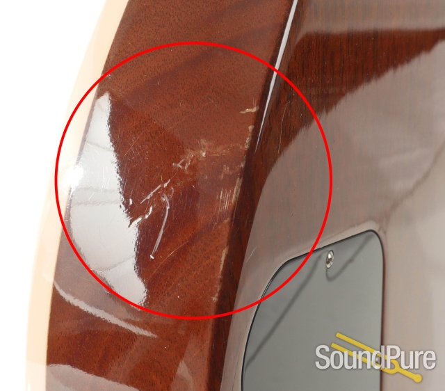 This is a gigged guitar and has pick/sleeve button scratching (pictured), and knobs show cracks on the tops.