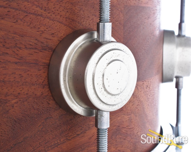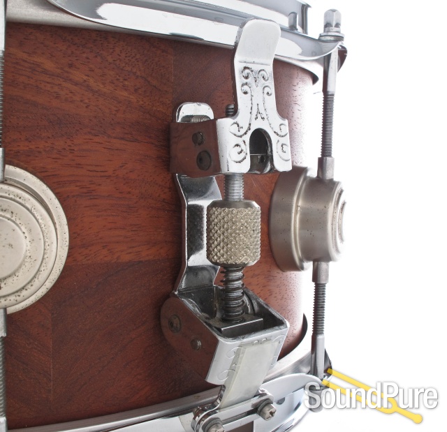 Segmented drums have been one of our favorites. The brickwork pattern and horizontal grain of segment shells make them more durable and rigid than staves and allow builders and players an opportunity to sample a variety of tone woods. Bubinga is about 50% harder than birch or maple which gives this drum some serious attack. The shell is roughly 3/8" thick and coupled with the denser wood can give you a nice focus at lower dynamics and full-bodied projection at high volumes. This unique snare drum comes with 8 DW satin nickel lugs and the Ludwig Millenium strainer.