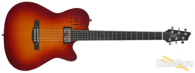 Custom Godin under Saddle Transducer and custom preamp with Volume, Mid, Treble and Bass controls as well as independent volume, treble and bass controls for the Humbucker.