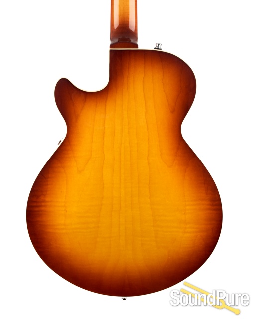 The Montreal Premiere Supreme features a beautifully figured flame maple top and back & sides, along with a bound headstock and fingerboard with large celluloid dot inlays. It is voiced with custom Seymour Duncan humbucker pickups and kept precisely in tune via the high-ratio Godin machine heads.