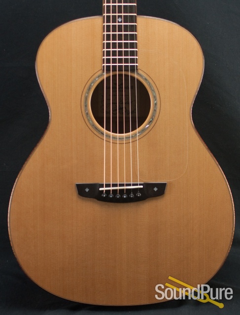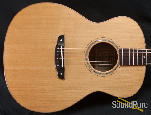 When James built the first maple and cedar Parlor, he had to build another just to see if it was an accident - the tone really surprised him. He felt compelled to make a model out of it. The tone is amazingly resonant, responsive and full for the size. Beautiful harmonics resound without being too overtone filled and the bass is rich but not boomy. A light fingerstyle or flatpick touch produces great volume.