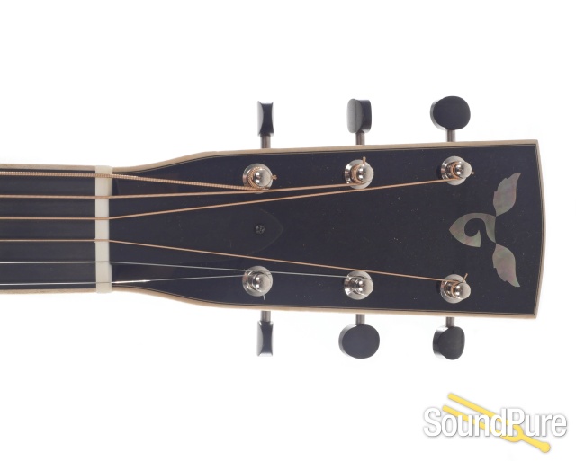 Its tone is extremely powerful in the bass and midrange, with an emphasis on a broad warmth without lacking treble. All of our Traditional series models features a custom, partially scalloped bracing pattern which produces a bit more 'boominess' in the bass and midrange. The peghead and bridge have been redesigned for a more conservative visual appeal, with open gear Waverly tuning machines contributing to its charm. It is attractively arrayed with a herringbone marquetry rosette and top purfling, and a chevron marquetry backstrip. It has been designed especially with the flatpicker and the bluegrass player in mind.