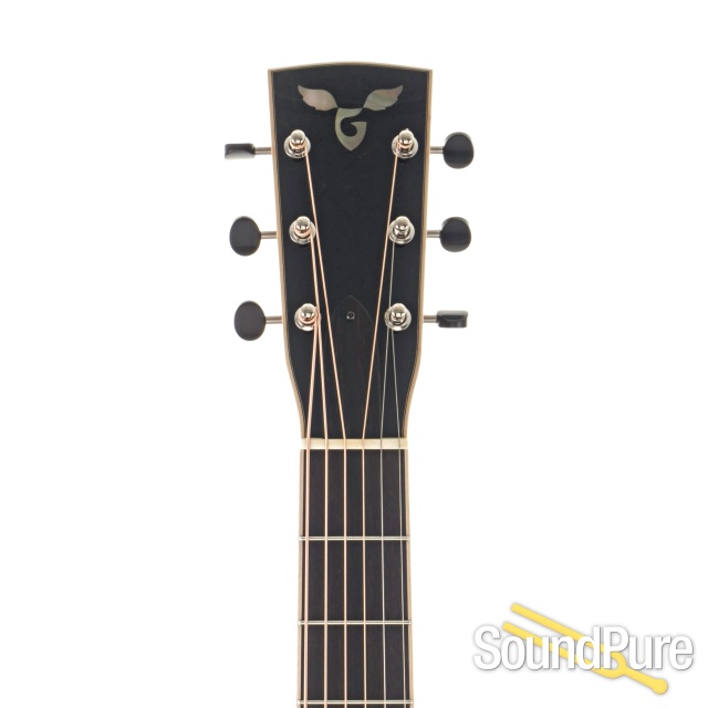 Its tone is extremely powerful in the bass and midrange, with an emphasis on a broad warmth without lacking treble. All of our Traditional series models features a custom, partially scalloped bracing pattern which produces a bit more ‘boominess’ in the bass and midrange. The peghead and bridge have been redesigned for a more conservative visual appeal, with open gear Waverly tuning machines contributing to its charm. It is attractively arrayed with a herringbone marquetry rosette and top purfling, and a chevron marquetry backstrip. It has been designed especially with the flatpicker and the bluegrass player in mind.