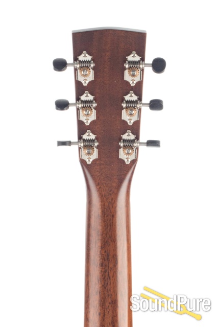 All of our Traditional series models features a custom, partially scalloped bracing pattern which produces a bit more 'boominess' in the bass and midrange. The peghead and bridge have been redesigned for a more conservative visual appeal, with open gear Waverly tuning machines contributing to its charm. It is attractively arrayed with a herringbone marquetry rosette and top purfling, and a chevron marquetry backstrip.