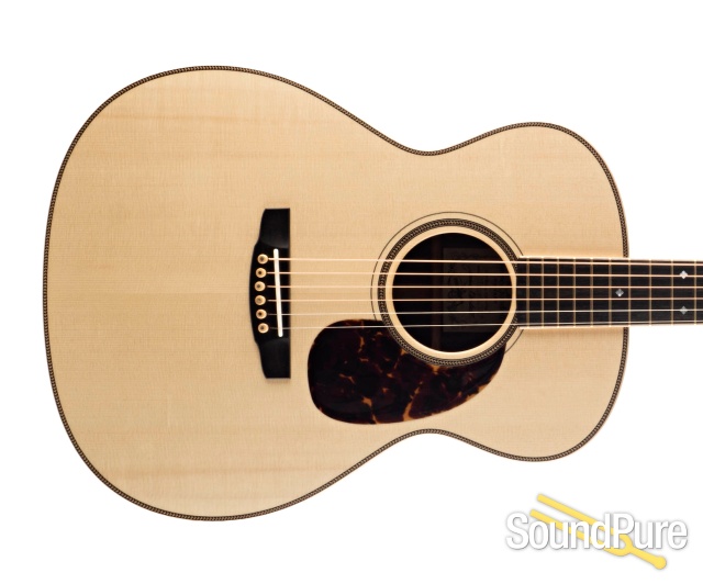 Its tone is extremely powerful in the bass and midrange, with an emphasis on a broad warmth without lacking treble. All of our Traditional series models features a custom, partially scalloped bracing pattern which produces a bit more 'boominess' in the bass and midrange. The peghead and bridge have been redesigned for a more conservative visual appeal, with open gear Waverly tuning machines contributing to its charm. It is attractively arrayed with a herringbone marquetry rosette and top purfling, and a chevron marquetry backstrip. It has been designed especially with the flatpicker and the bluegrass player in mind.