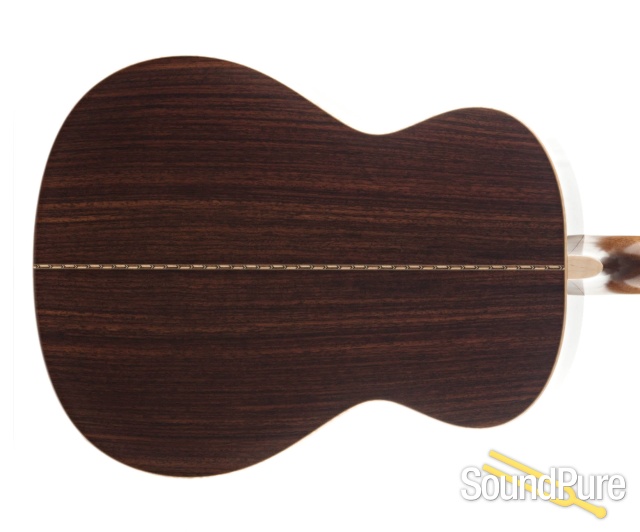 Its tone is extremely powerful in the bass and midrange, with an emphasis on a broad warmth without lacking treble. All of our Traditional series models features a custom, partially scalloped bracing pattern which produces a bit more 'boominess' in the bass and midrange. The peghead and bridge have been redesigned for a more conservative visual appeal, with open gear Waverly tuning machines contributing to its charm. It is attractively arrayed with a herringbone marquetry rosette and top purfling, and a chevron marquetry backstrip. It has been designed especially with the flatpicker and the bluegrass player in mind.