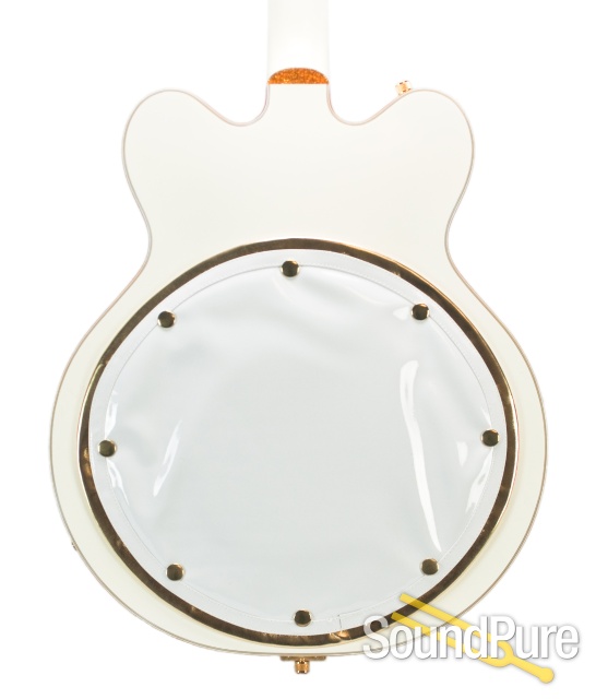 One of the most beautiful Gretsch® guitars ever made, a 1962 ad called it "the ultimate guitar." This modern version of the White Falcon features a double-cutaway hollow body with an arched top, parallel tone bar bracing, oversized bound f-holes, and gold-sparkle binding. Other features include two-piece maple neck, ebony fingerboard with gold-sparkle binding and Neo-ClassicTM thumbnail inlays, V-shaped FalconTM headstock with gold-sparkle binding and horizontal gold-sparkle Gretsch logo inlay, dual High Sensitive Filter'TronTM pickups, three-position pickup switch, three-position master tone switch, standby switch, gold plexi pickguard with Falcon motif, gold-plated hardware, Grover® ImperialTM tuners, white back pad, Space ControlTM bridge and Bigsby® B6G vibrato tailpiece.