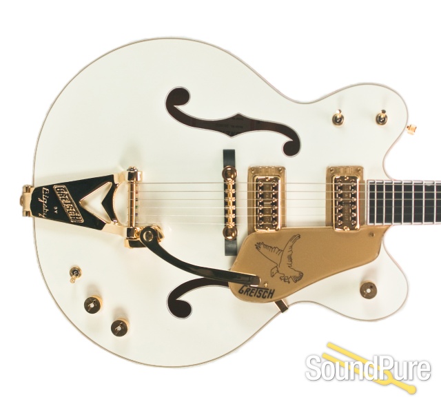One of the most beautiful Gretsch® guitars ever made, a 1962 ad called it "the ultimate guitar." The equally beautiful modern version has a double-cutaway hollow body with an arched top, parallel tone bar bracing, oversized bound f-holes, and gold-sparkle binding. Other features include two-piece maple neck, ebony fingerboard with gold-sparkle binding and Neo-ClassicTM thumbnail inlays, V-shaped FalconTM headstock with gold-sparkle binding and horizontal gold-sparkle Gretsch logo inlay, dual High Sensitive Filter'TronTM pickups, three-position pickup switch, three-position master tone switch, standby switch, gold plexi pickguard with Falcon motif, gold-plated hardware, Grover® ImperialTM tuners, white back pad, Space ControlTM bridge and Bigsby® B6G vibrato tailpiece.