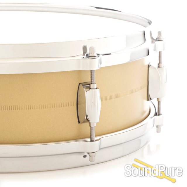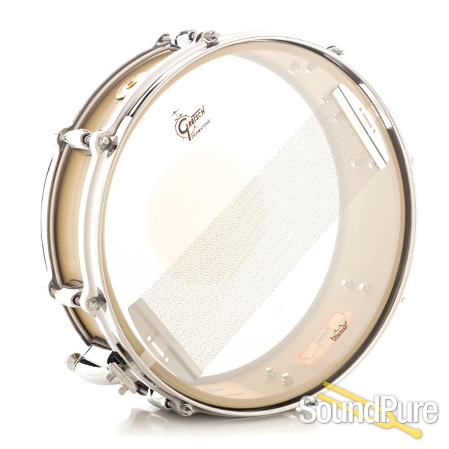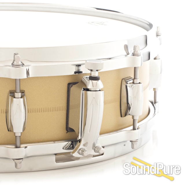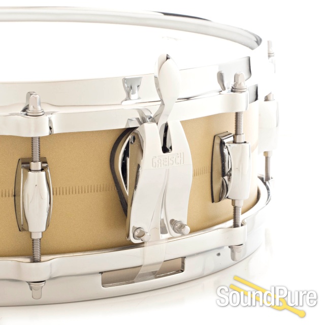 The key elements included a 4.25x14” 1.2mm brass shell, 45 degree bearing edges, 20-strand snare wires and 4mm Die Cast hoops, making this instrument one of the more distinctive in the Gretsch snare drum assortment. The shell’s surface is finished with an applied sand blast texture for a unique look and tighter overall sound.