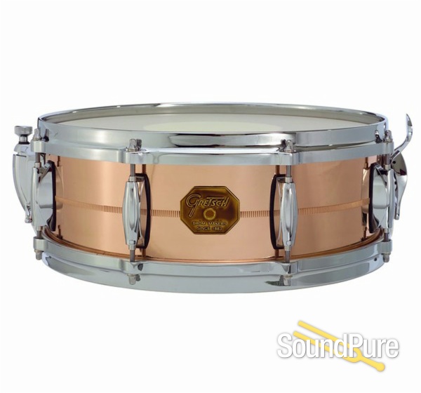 All snare drums feature Ligtning throw-off, top and bottom die-cast hoops, center knurl pattern 'Snap-In' key holder, classic Gretsch 'Drop G' octagon badge, Permaone coated top/clear bottom heads and 42-Strand snare wire (24 wires on 13-inch drums). Shell options include Chrome over Brass, Solid Aluminum, Solid Steel, Hammered Chrome over Brass, Hammered Copper and Spun Brass.