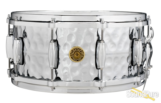 All snare drums feature Ligtning throw-off, top and bottom die-cast hoops, center knurl pattern 'Snap-In' key holder, classic Gretsch 'Drop G' octagon badge, Permaone coated top/clear bottom heads and 42-Strand snare wire (24 wires on 13-inch drums). Shell options include Chrome over Brass, Solid Aluminum, Solid Steel, Hammered Chrome over Brass, Hammered Copper and Spun Brass.