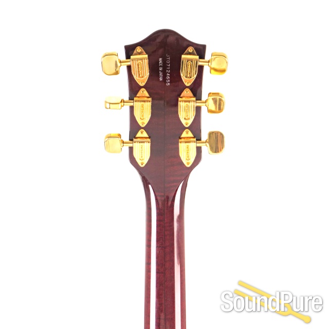 The Gretsch 6122 Chet Atkins Country Gentleman is a refined hollowbody classic that blends elegance, clarity, and unmistakable Gretsch character. Its flamed maple body delivers warm, controlled resonance, while the ebony fingerboard and comfortable maple neck provide a smooth, confident playing feel. Dual TV Jones Super’Tron Classic Plus pickups offer articulate definition with rich harmonic depth, perfectly suited for clean sophistication and expressive nuance. Finished in gold nitrocellulose with a Bigsby vibrato, this Japan-made Country Gentleman feels thoughtfully crafted and musically inspiring—an iconic, performance-ready instrument and a timeless investment for players who value tone, touch, and heritage.