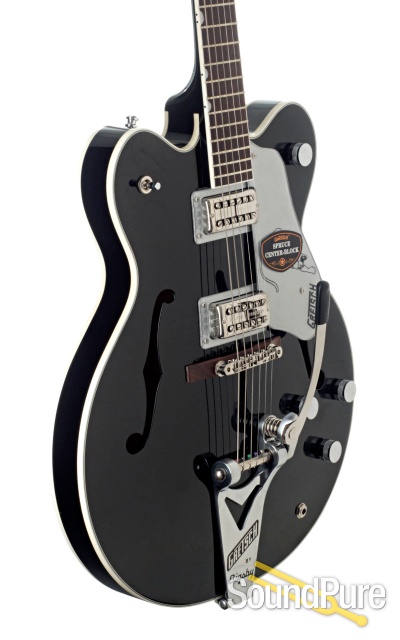 A pair of High Sensitive Filter’Tron™ humbucking pickups responds to every note dynamically—snarling or purring according to how hard you strike the strings. The control complement—separate bridge and neck volume controls, three-way pickup switching, no-load master tone and also a master volume—allows for near-infinite tonal variations. The all-new Gretsch “Squeezebox” paper-in-oil caps add smooth vintage tone while the treble bleed circuit lets your guitar retain all of its tasty clarity when rolling the volume control down. The standard “U”-shaped maple neck bears a 12”-radius rosewood fingerboard with 21 durable medium jumbo frets for a memorable playing experience that works with any fret-hand style. A pinned “rocking” bar bridge reacts in concert with the Bigsby B6CP vibrato tailpiece for stable tuning while the teflon-coated GraphTech® TUSQ™ XL nut lets the strings slide freely, without binding in the slots. A thinner, 2.25” body provides maximum comfort during long sets while the innovative Gretsch “ML” bracing allows the guitar to retain that rich, full hollow body sound. In a uniquely Gretsch touch, the Bigsby tailpiece is now string-through, making it quicker (and easier) to change strings as well as providing increased vibration transfer for enhanced sustain.