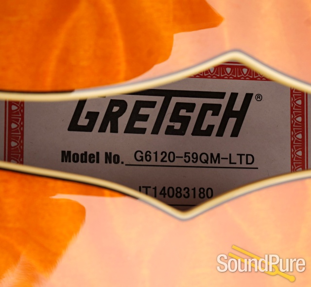 Designed for pure tone and slick, comfortable playing feel, this guitar features the classic aesthetics true Gretsch fans love - nickel G-arrow control knobs, aged white binding with black purfling, durable gloss nitrocellulose lacquer finish, aged pearloid thumbnail inlays, gold vintage thick plexi pickguard with Gretsch logo and nickel Grover® Sta-Tite™ tuning machines. Elegant style and refined sound combine to make the G6120T-59 Vintage Select Edition '59 Chet Atkins® Hollow Body with Bigsby® a Gretsch aficionado's dream guitar.