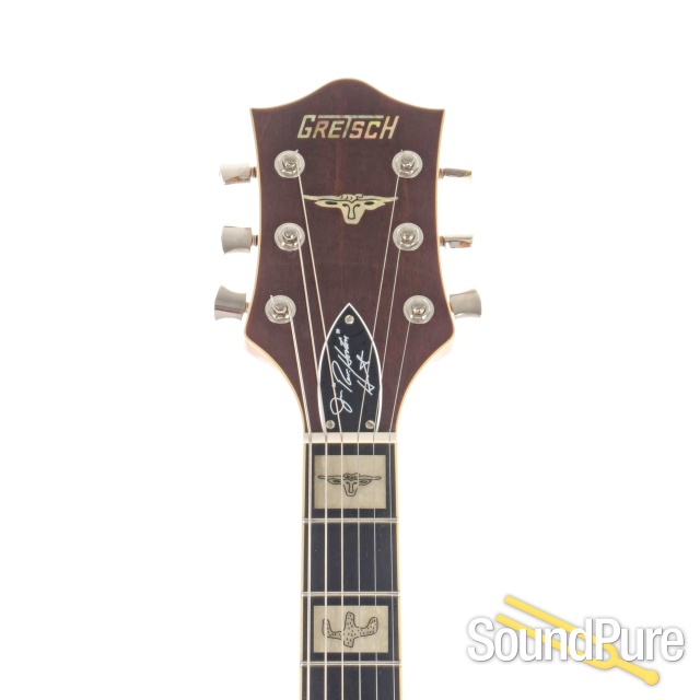 Features include TV Jones® Classic pickups, pinned Adjusto-Matic™ bridge, Gotoh® locking tuners, clear pickguard, "G" body brand, bound oversized F-holes, stained maple headstock overlay, multiple aged body bindings and aged fingerboard and headstock binding. The aged vintage wide-block pearloid inlays feature a western motif of cactus, steer heads and fences, and the headstock features pearloid steer head and Gretsch logo inlays.