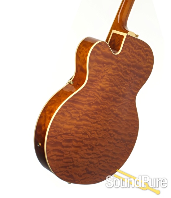 The G6120TGQM-56 features a 2.75” deep body that is outfitted with stunning highly figured quilt maple and finished in a rich, opulent Roundup Orange nitrocellulose lacquer finish.