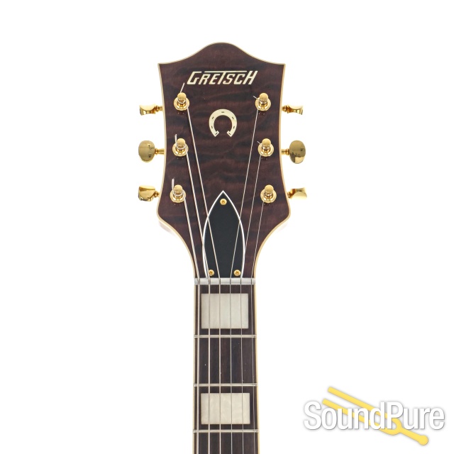 Designed for pure tone and slick, comfortable playing feel, this guitar features the classic appointments Gretsch fans desire - gold G-arrow control knobs, aged white binding with black purfling, aged pearloid wide-block inlays, gold vintage thick plexi pickguard with ghosted Gretsch logo and Chet Atkins sign post graphic, Bigsby B6CBDE vibrato tailpiece, compensated aluminum bridge with pinned rosewood base, polished aluminum nut, and Grover Sta-Tite tuning machines. A resurrected blast from the past with elegantly refined style and sound, the G6120TGQM-56 is sure to satisfy any devotee of Gretsch's golden era.