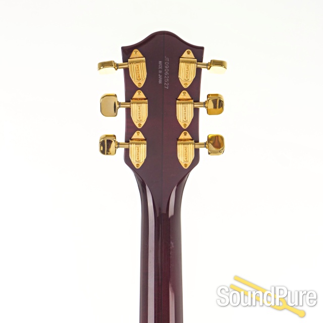 All of the '59 Gent's classic features are here - laminated 5-ply figured maple top with painted F-holes, "wire" vibrato arm, gold G-arrow control knobs, aged white binding with black purfling, gloss nitrocellulose lacquer finish, aged pearloid thumbnail inlays, gold vintage thick plexi pickguard with Gretsch logo and gold Grover® Imperial™ tuning machines with 'butterbean' buttons. A truly classic instrument with refined style and sound, the G6122T-59 Vintage Select Edition '59 Chet Atkins® Country Gentleman® Hollow Body with Bigsby® is a fine addition to any guitarist's collection.