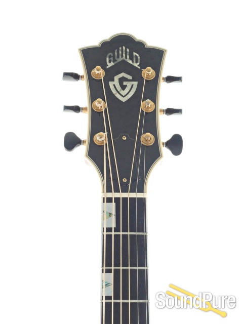 Other special features include custom D-55-style abalone/mother-of-pearl fret markers rotated 90 degrees and located on the bass side of the fingerboard, a slightly shallower body than that of the standard F-47 on which the model is based, scalloped red spruce bracing, abalone rosette, three-piece mahogany neck with rosewood center, 12″ fingerboard radius, stylized Guild “G” headstock overlay, extra tuner spacing to accommodate Dykes’ signature behind-the-nut string bends, bone nut and saddle, and a pure gloss nitrocellulose lacquer finish. Each Doyle Dykes Signature Model comes with a dark brown hard-shell case lined with dark-green plush.
