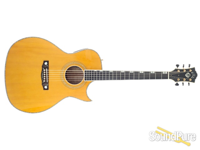The Guild Doyle Dykes Signature Model is the result of extensive collaboration among Dykes and master luthier Ren Ferguson. Crafted to Dykes’ exacting specifications, the cutaway grand orchestra guitar delivers a rich, full and balanced sound that will please the most discerning guitarist. It’s an incredibly articulate instrument, with truly stunning headroom and dynamic range. With an abalone-trimmed AAA-grade red spruce top and AAA quilted big-leaf maple back and sides, the guitar looks as amazing as it sounds. The dark-tinted top imparts an aged look, and the 20-fret ebony fingerboard and abalone-inlaid bridge contribute to a distinctively elegant appearance.
