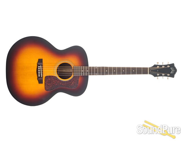 The Guild F-40 Traditional embodies the features that make jumbo-sized acoustics some of Guild’s most beloved and revered models. Using a high-grade solid Sitka spruce top and solid African mahogany back and sides, Guild adds scalloped Adirondack braces for power, nuance and responsiveness. The F-40 Traditional’s three piece mahogany and walnut neck is topped with an Indian rosewood fingerboard and is joined to the body with an authentic dovetail joint. This classic jumbo is handsomely appointed with a tortoiseshell pickguard, rosette, and binding, a genuine mother-of-pearl Guild peak and chesterfield logo inlaid on the headstock, and nickel-plated open gear tuners. A lustrous nitrocellulose lacquer provides an elegant finish to this masterpiece, optimizing the beauty and resonant qualities of its premium woods.
