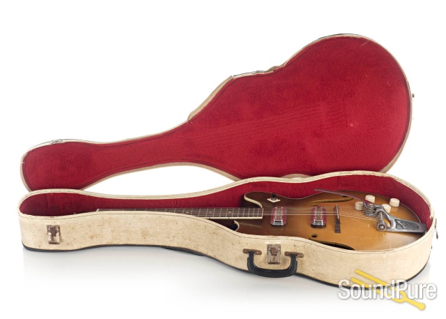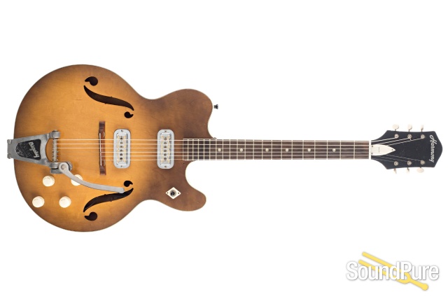By our estimation, this H74 Meteor is totally original including the chipboard case, and is missing just the pickguard. This came to us in wonderfully clean condition and sounding like a dream. For added value, our in-house luthier installed a ground wire (it never had one!). If you've ever had the pleasure of plugging in real-deal Dearmond Gold Foil pickups, you know exactly what this instrument is about. Lush tones with tons of dynamic response, easy on the eyes and on your wallet!