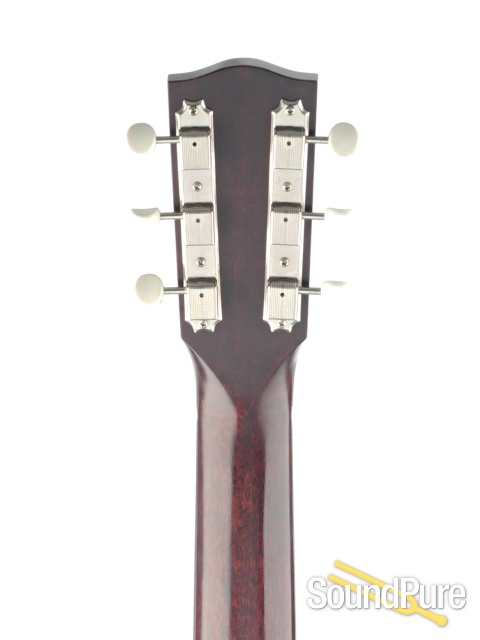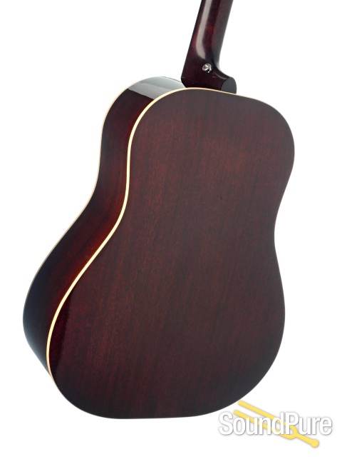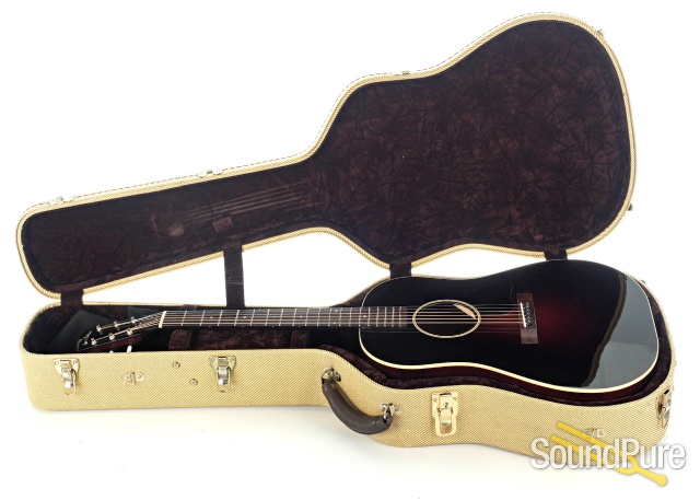 Take the H&D standard DS. Convert it to a flat top with a short scale. Then take a chisel to the bracing to compensate for the shorter scale length. Strip it back to an unostentatious dress code but maintain the dark sunburst, and you have a workingman’s guitar of epic proportions. This guitar can pick a gentle child’s tune or rage across a stage.