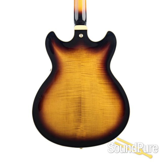 Absolutely laden with gorgeous flame maple (including the pickguard) this semi-hollow from Ibanez's Artstar series has a bright snappy tone and a wonderful modern feel. The body contours are slim making it comfortable to navigate the enitre fretboard smoothly, quickly, and easily. And the Tri-Sound switch for the neck pickup offers Series/Split/Parallel operation to offer a wide range of sonic possibility!