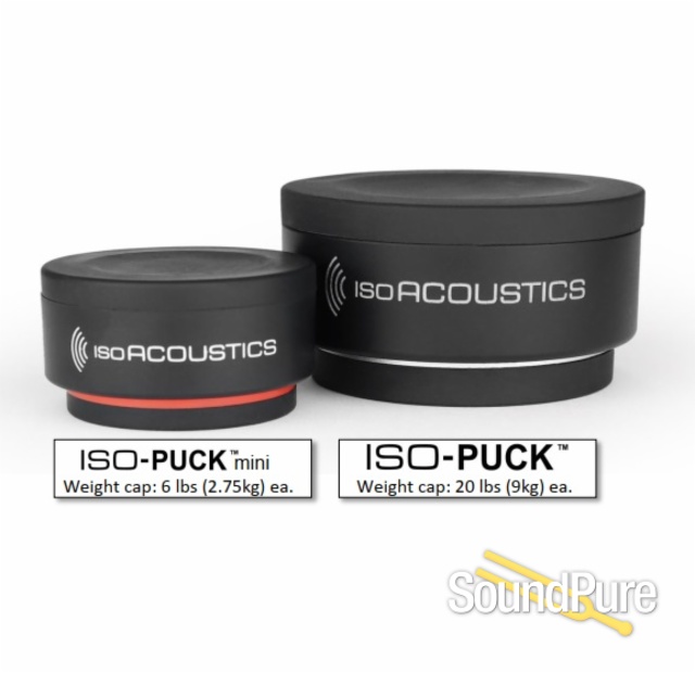 The ISO-PUCK mini have a weight capacity of 6 lbs (2.75 KG) per puck. 3 or more pucks can be used at a time depending on the weight of the speaker or monitor.