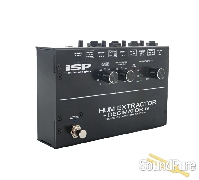 ISP Technologies introduces the revolutionary patent pending HUM EXTRACTOR™ + DECIMATOR G, two channel, ultimate noise reduction system. After years of musicians fighting the major noise problem of power line frequency hum, ISP Technologies eliminates this dreaded noise with the new patent pending HUM EXTRACTOR™. Power line frequency hum is most commonly caused by stray magnetic fields generated from transformers or power lines in close proximity to the instrument pickups. While Hum Bucking pickups have been in use for years to help reduce this problem, if the level of hum is severe, even Hum Bucking pickups are not enough and many players still prefer the sound quality and tone of single coil pickups.