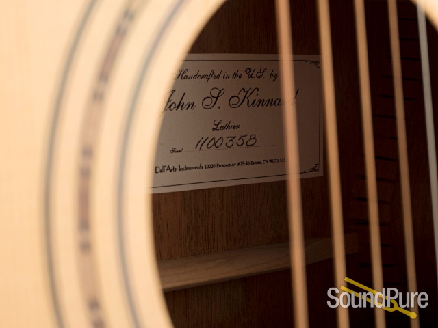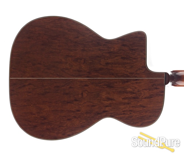 A fantastic instrument that incorporates the best qualities of late 000-18s with the feel and function of more modern guitars. We love the relatively flat, comfy neck and that graceful cutaway--ideal for folks looking for upper fret access without having to sacrifice tone. The setup our luthier performed is certainly low enough for sensitive, warm fingerstyle, but flatpicking is a balanced, breezy time, too. Cosmetic decisions like the offsetting of the bridge pins and that lovely top border/rosette pattern will bring a smile to your face before you even play this beauty. Wonderful!