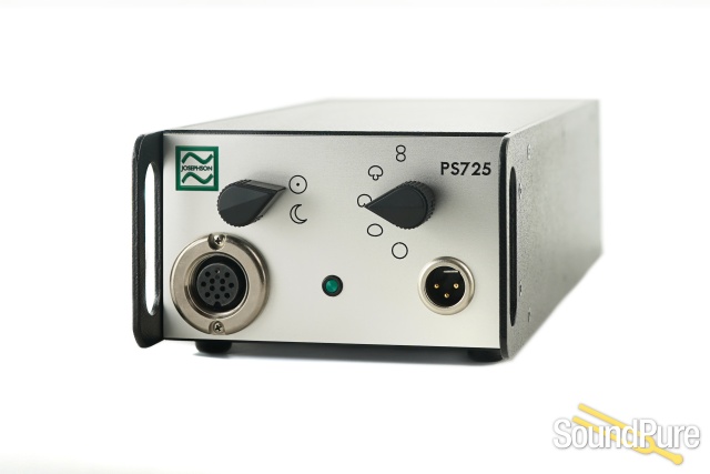 The PS725 power supply allows operation on 100 to 240 volt mains supplies and allows selection of five directional patterns and two signal/dynamics characteristics. The “sun” setting operates at full gain, with a high sensitivity of 40 mV/Pa, and the warmth characteristic of many vacuum tube mics. In the “moon” setting, a small amount of negative feedback is provided from a dedicated winding of the output transformer back to the front end of the amplifier. This reduces the sensitivity by 12 dB, to 10 mV/Pa, and linearizes the circuit to provide a more neutral sound at high levels. Switching between the two modes is accomplished with a precision reed relay inside the microphone. Five separate power supply sections are used: a preregulator for the vacuum tube filament along with a final regulator inside the microphone so that filament voltage is not changed by cable length, two low noise supplies for the high voltage regulator, and a precision shunt regulator for the vacuum tube plate and polarization voltages.