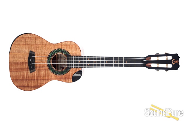 A 20 year milestone for Kanile`a `Ukulele is celebrated in this exquisite instrument designed by company co-owner and master luthier Joe Souza. Starting with a 5A Master Grade curly koa solid body and contrasting koa binding, elements of the number 20 can be seen: with emerald green leaves in the rosette, 20 mature koa leaves encircling the sound hole and 20 keiki leaves in the lower center of the rosette. And then there are Kanile`a exclusive enhancements that players of all levels will truly appreciate. The Kanile`a Platinum 2018 introduces the all new redesign of the Kanile`a traditional thin slotted headstock outfitted with ultralight 16:1 ratio Gotoh Stealth geared tuners. Add to that the company’s exclusive TRU-R (Total Resonating `Ukulele Redesigned) bracing and a Mass Reduction Channel for even more vibration and resonance and you have an `ukulele that is a delight to play.