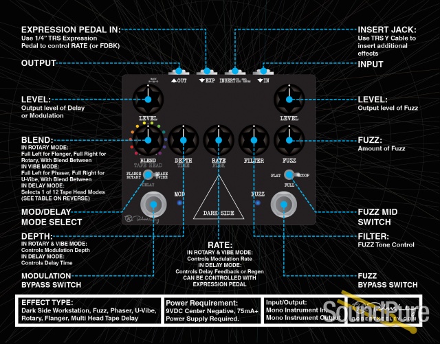 Effect Type: Dark Side Workstation, Fuzz, Phaser, U-Vibe, Rotary, Flanger, Multi-Head Tape Delay
