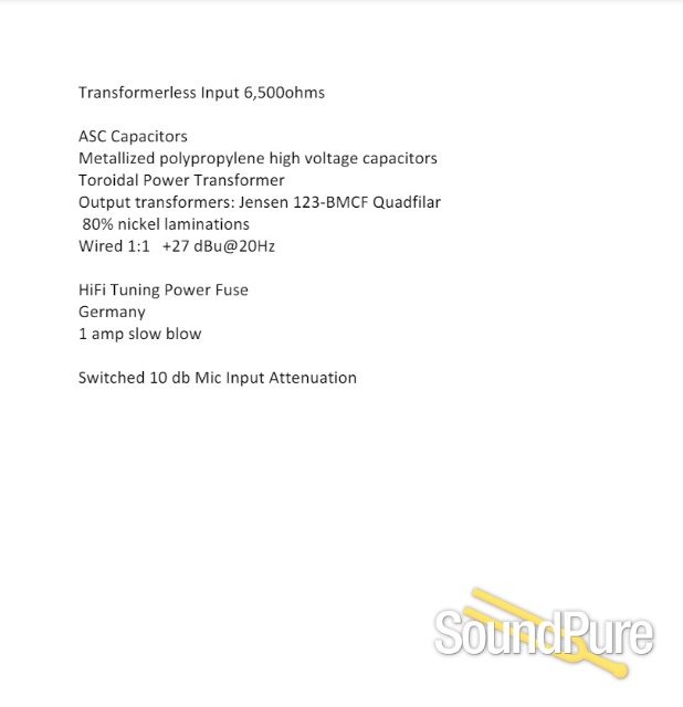 Utilizing the Jensen JT-115k input transformer and two ECC803/12AX7 vacuum tubes per channel. This configuration provides >74dB of gain (usually about 76db ...) with a typical non-weighted EIN of -124 to -126dB referencing 150ohm. All other design elements are the same.