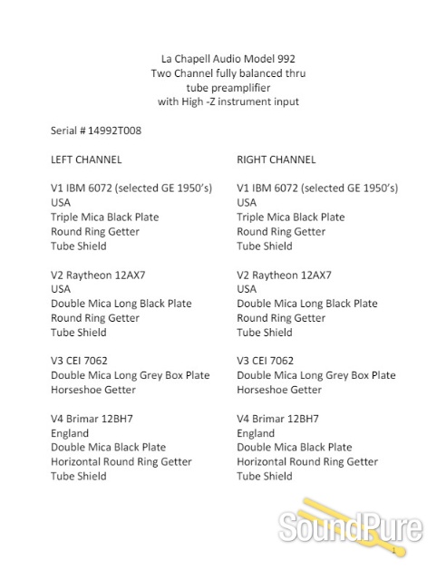 If you're after the best of the best in dual mono tube preamplification, you're looking for the LaChapell 992EG! Creamy, rich, round, yet detailed - the 992EG is everything you want and expect in a world-class tube preamp! This unit has been professionally modified, (including tube biasing) with spec sheets shown in photos. In Used, Very Good to Excellent Condition.