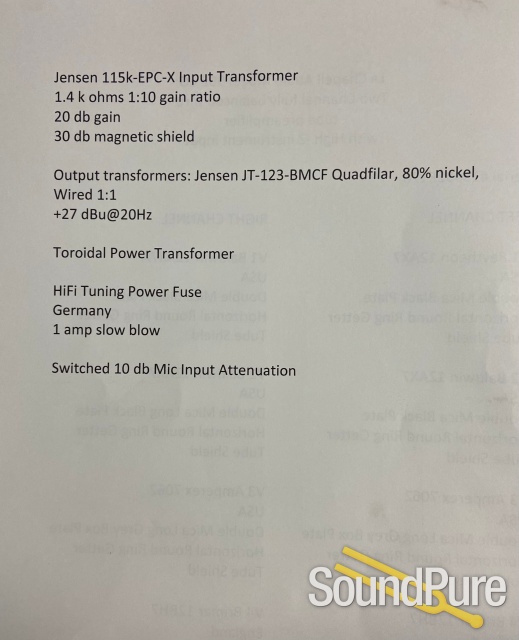 Utilizing the Jensen JT-115k input transformer and two ECC803/12AX7 vacuum tubes per channel. This configuration provides >74dB of gain (usually about 76db ...) with a typical non-weighted EIN of -124 to -126dB referencing 150ohm. All other design elements are the same.