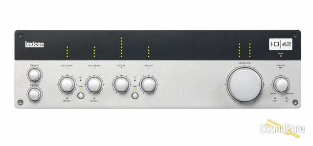 The I-O|42 can record four tracks at once and includes 4 combi-jack mic/line inputs with +48V phantom power, 2 TRS balanced line outputs, 2 hi-Z instrument inputs, 2 high power 1/4" headphone outputs, S/PDIF and MIDI I/O. Dedicated knobs and meters offer easy access to input and output levels and locking combi-jacks make sure that a connection is not lost in the middle of a performance.