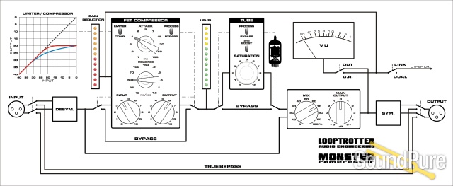 Monster Compressor is built with the use of the best pieces of analog technology available. Within the highest quality minimalistic signal path there are integrated circuits, discreet circuits and electron tubes. The symmetrization and de-symmetrization circuits provide the neutrality of the sound, and those are based on integrated circuits dedicated to sound processing. The output of Monster Compressor is secured with capacitors also designed for sound.