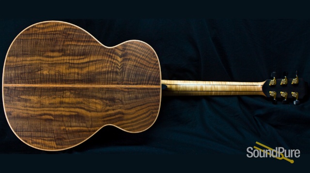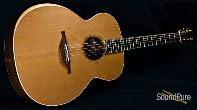The walnut is exquisitely figured and the cedar is incredibly tight. The Maple neck compliments every other wood shade perfectly. Wood. Wood. Wood. That's what we acoustic players want to see. Beautiful cuts in perfect combination. Just about my favorite rosette of all time, too.