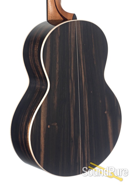 George puts a lot of work into all his builds, but his birthday present to the guitar world is something else. The elegant curves remind you of a jumbo in a slope-shouldered 00-sized package, and what you get from that petite shapeliness is very well-balanced tone with sweet midrange, bold bass and smooth treble. The AAAA ebony back and sides surely contribute to that piano-like sound, and the similarly AAAA-graded Alpine spruce softens up the treble content while also providing subtle overtonal complexity and plentiful sustain without sacrificing clarity. The neck is immediately playable, and the finish on the guitar is a Goldilocks fit betweeen satiny and glossy. A very special guitar made by a very special man for a very special birthday.