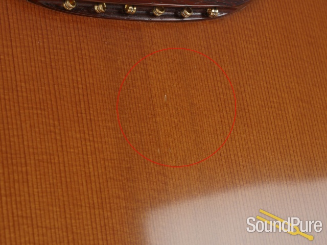 Several tiny indentions behind the bridge, likely due to steel string ball ends coming in contact with the top finish.