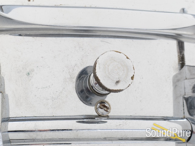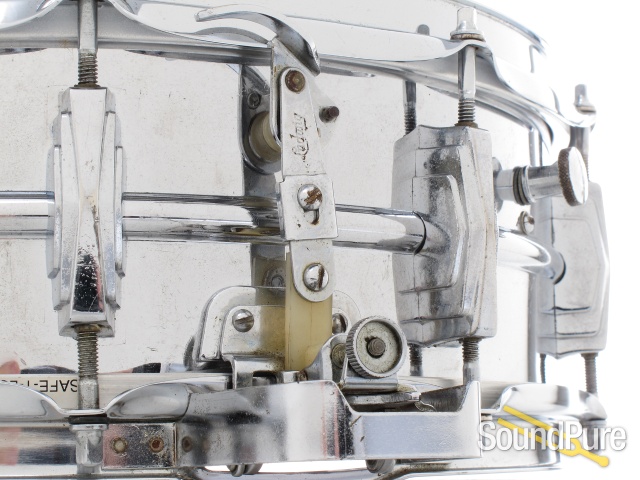 This is a Chicago-made Ludwig 5x14 chrome-over-brass Super Sensitive snare drum that is here on consignment. It's a Keystone badge and definitely a drum for a player and not a collector. Considering its age it is in good condition with slight chrome pitting on the lugs and shell. There is some heavy scratching around the badge both on the inside and outside of the shell, where it looks like someone attempted to remove the badge. The throw-off snare-sensitivity dials and muffler work well with very little resistance. The heads and snare wires are relatively new and the drum will ship in a hardshell foamed case.