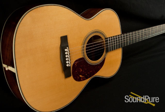 This OM was used for a short period in our own studio. After some light use on a few sessions, we have decided to rotate it out and put it on sale to our customers at a great price. The 4.625" body depth offers a fuller low-end and a greater frequency range, making it ideal for a variety of playing styles. While many OMs are used primarily as fingerstyle guitars, this one sounds amazing for strumming and flatpicking--thanks in large part to this deeper body. The Brazilian Rosewood provides beautiful overtone content and a lush natural reverberation. The fit and finish is flawless, and the back and sides have that unmistakable Brazilian figure. The only sign of wear is a couple of minor blemishes on the top that are only visible upon close inspection. Call Sound Pure today to take advantage of this incredible deal!