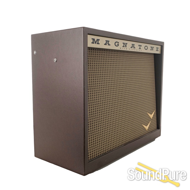 Clothed in the vintage brown and gold cosmetic, the Panoramic Stereo brings the Magnatone stereo experience to a smaller , more convenient size. Two 10" speakers are powered by four EL84s push pull 12+12 watts of all tube stereo power for a very compact and wide sounding amplifier.