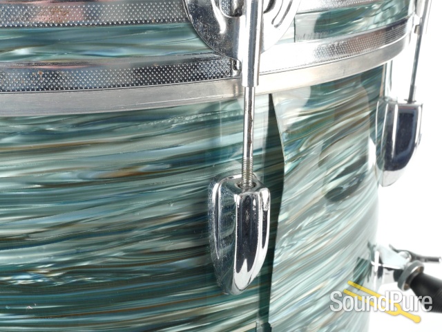 This is a Majestic DeLuxe 1960s-era drum set with a 14x20, 8x12, 14x14, and a 5x14 configuration. It is here on consignment and is a great player set. Produced in the 1960s, the toms have gray interiors and the original calf-skin resonant heads.